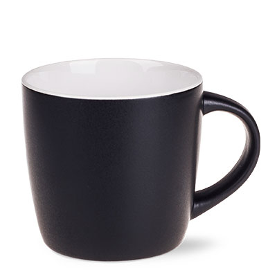 A very popular advertising oval mug with modern, matt glaze. The glossy, colorful inside makes an excellent contrast with the black satin exterior. The mug is available in many color versions.