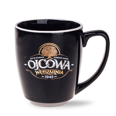 A capacious, black advertising mug with an ovoid shape and characteristic, white inserts on the rim and in the lower part. The large handle allows for a comfortable grip.