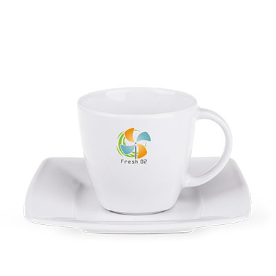 A porcelain advertising cup available in two sizes. This design features delicate edges visible in the lower part.