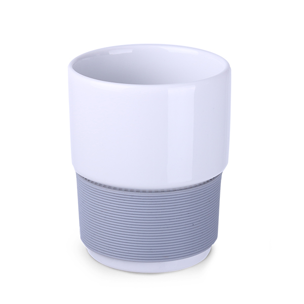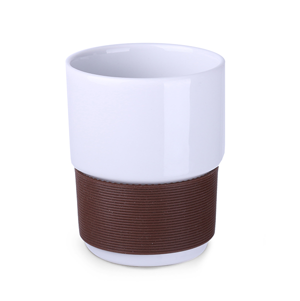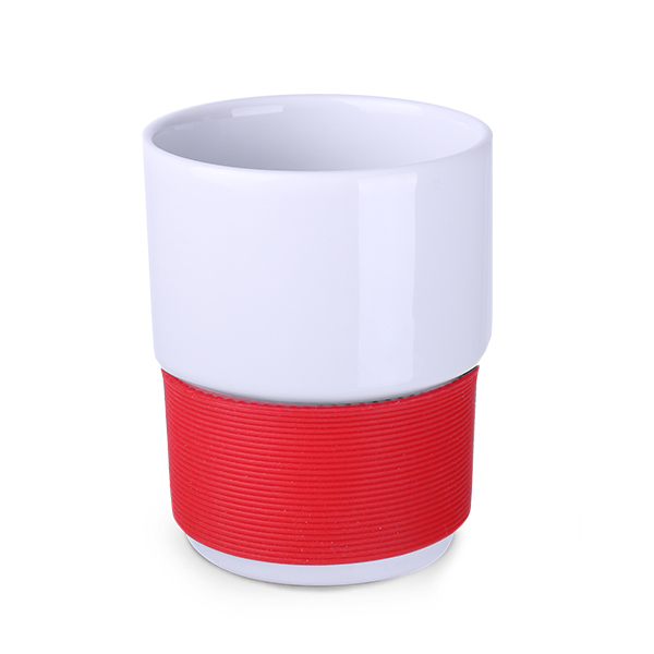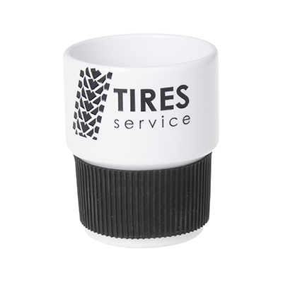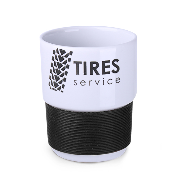 Medium size porcelain advertising mug without handle. The 40mm wide bands are available in 7 colors: white, orange, red, green, navy blue, brown and black.