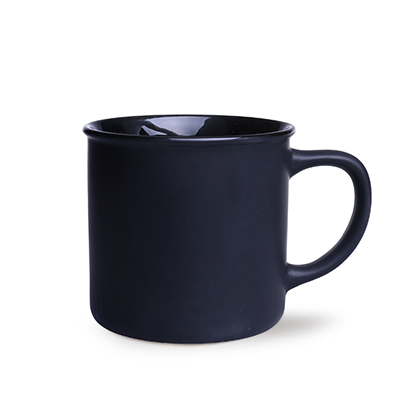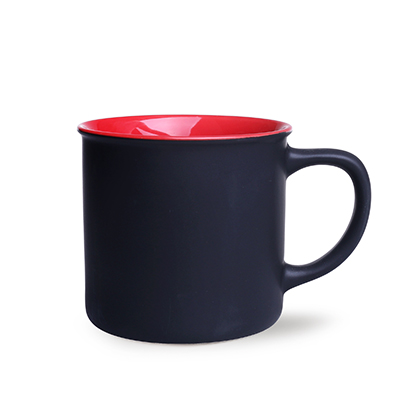 Small in appearance, but with a large capacity, ceramic mug with a black, matte outside surface and a colorful interior.