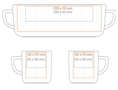 Print on the handle (40x10 mm) Print on the inside (60x15 mm) Print on the bottom inside (ø30 mm) Print on the bottom outside (ø40 mm) Over the rim imprint Personal print |