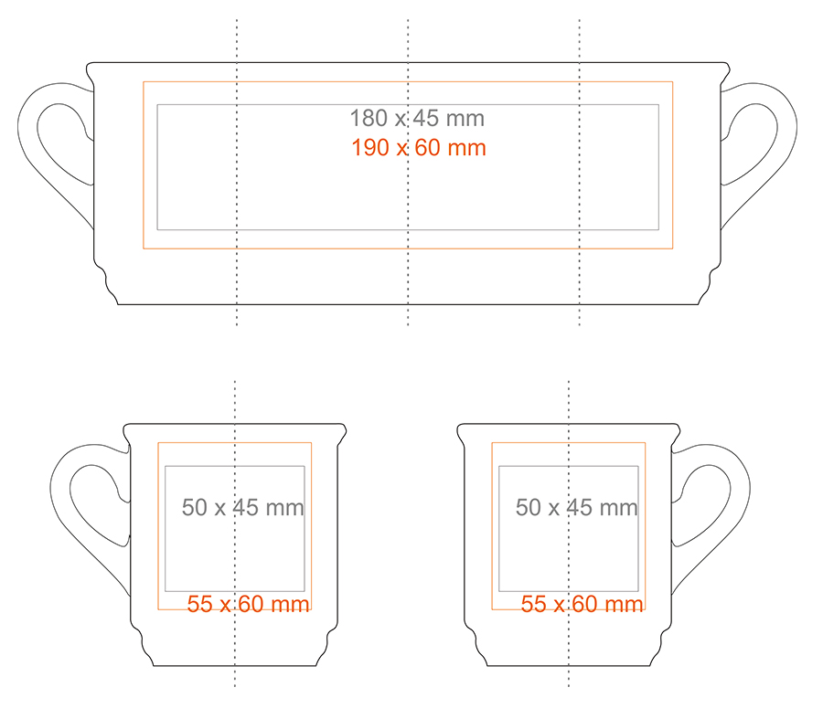 Print on the inside (40x20 mm) Print on the bottom inside (ø30 mm) Gold print Silver print Over the rim imprint Hand Made - rim painting Personal print Personalisation engraving |